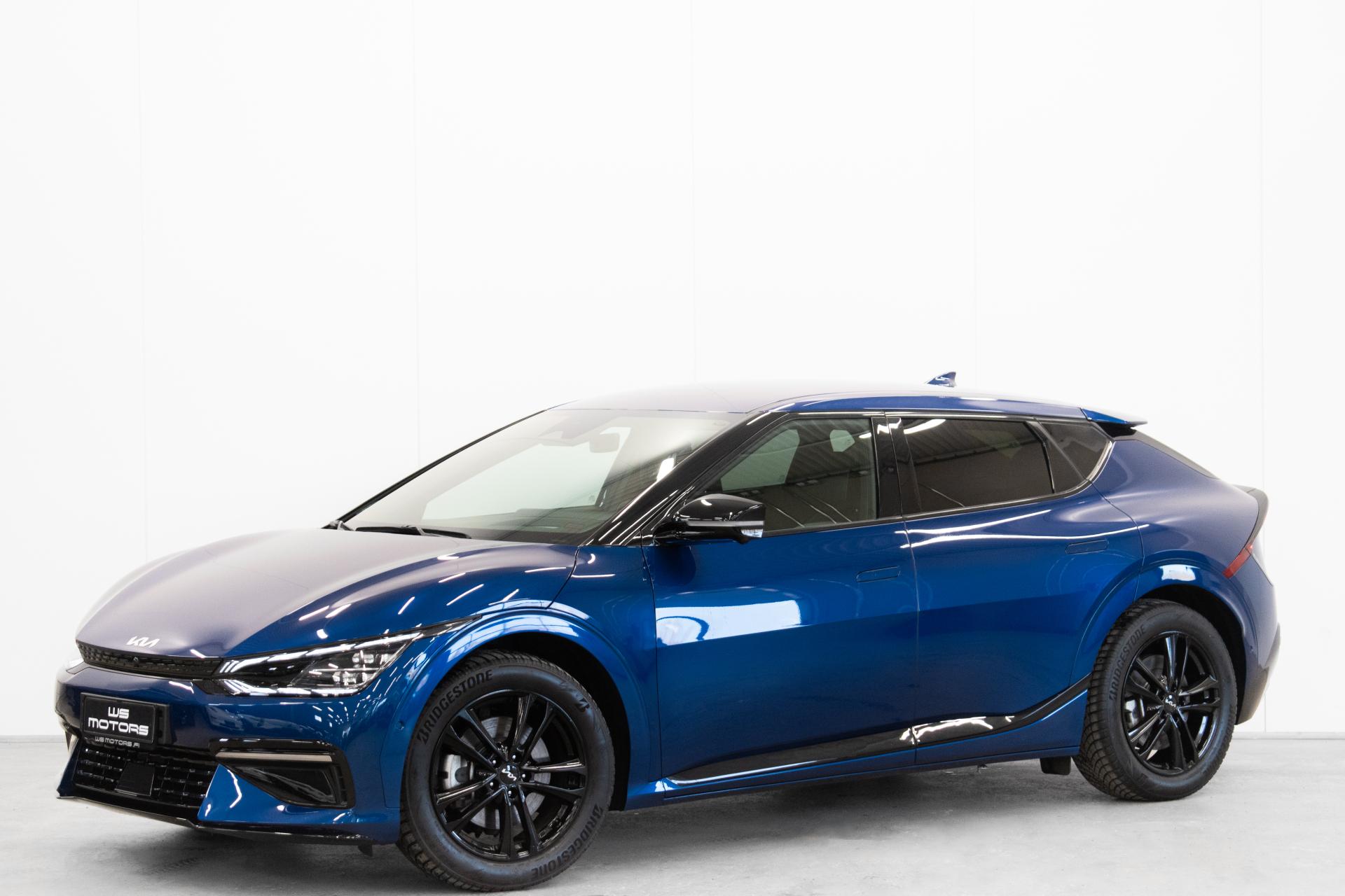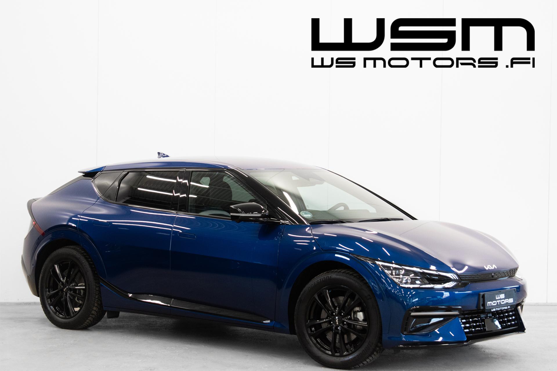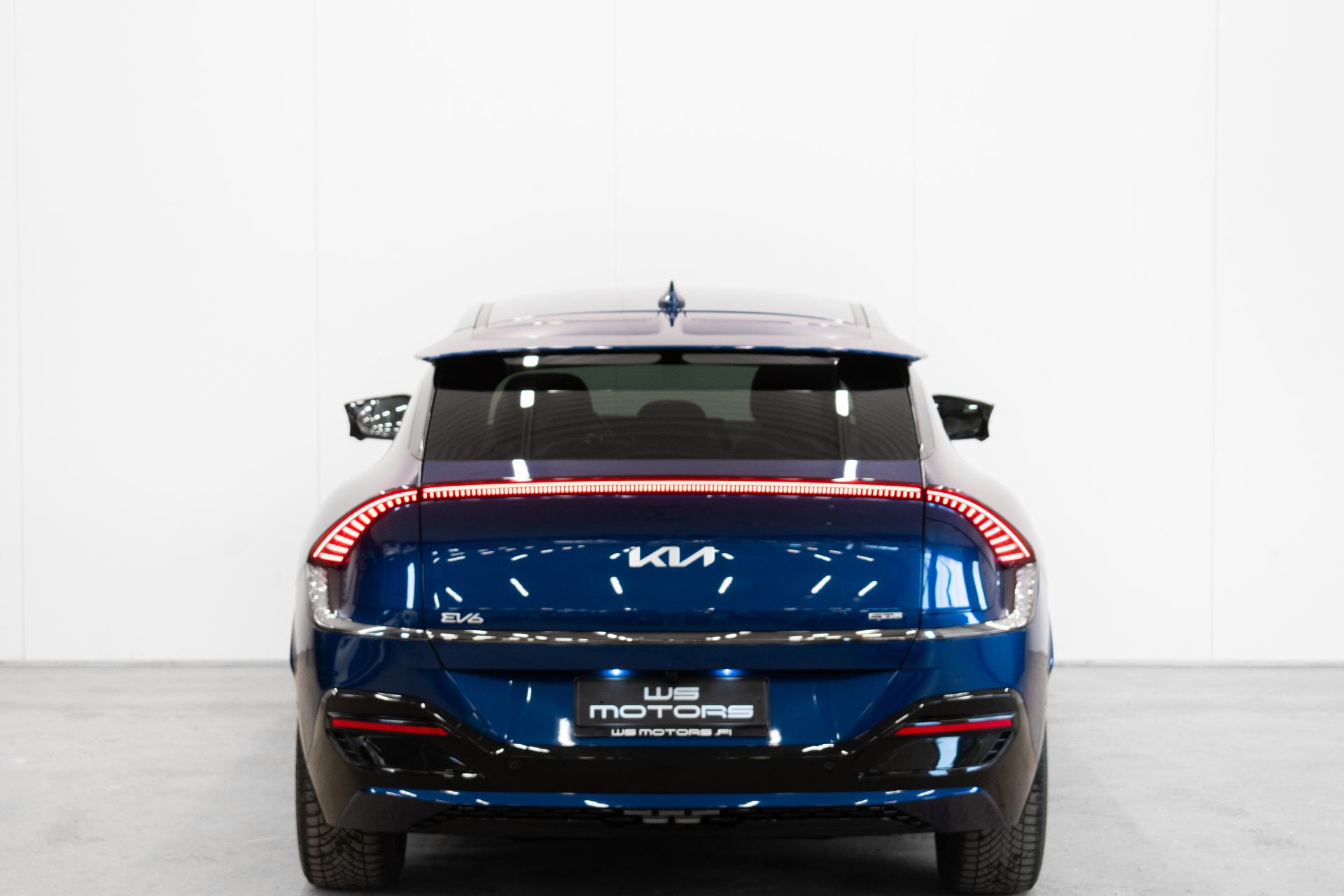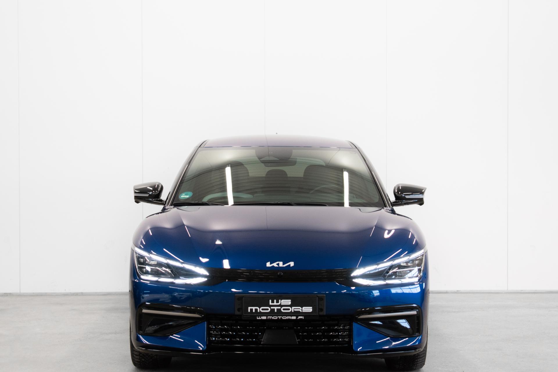 Näyttävä KIA EV6 GT-Line nelivetomalli halutuilla lisävarusteilla. Erittäin hieno sininen ulkoväri tuo GT-line varustellun auton muodot arvoonsa.